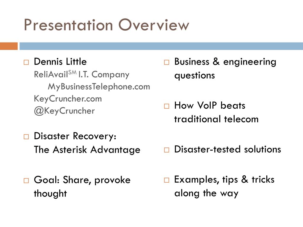 Presentation Overview • Dennis LittleReliAvailSMI.T. Company MyBusinessTelephone.com@KeyCruncher (.com) • Disaster Recovery:The Asterisk Advantage • Goal: Share, provoke thought & feedback