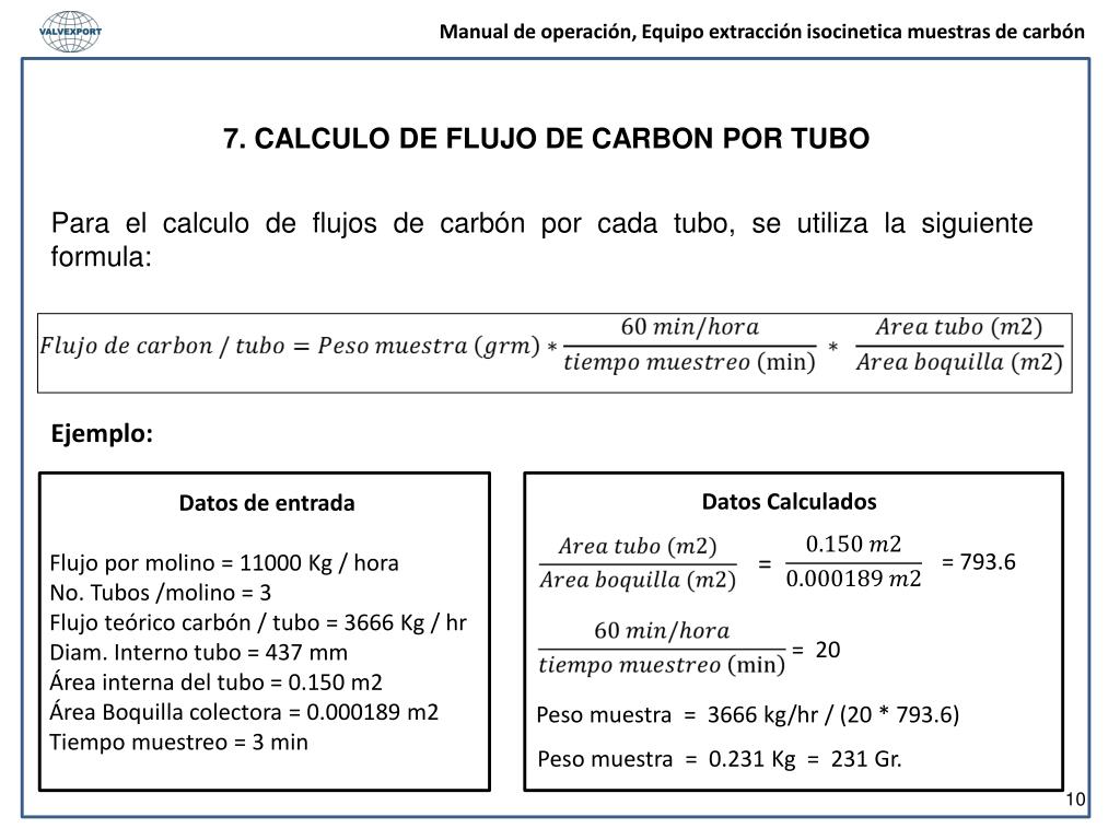 7. CALCULO DE FLUJO DE CARBON POR TUBO Para el calculo de flujos de carbón por cada tubo, se utiliza la siguiente formula: Ejemplo: Datos Calculados Datos de entrada Flujo por molino = 11000 Kg / hora No. Tubos /molino = 3 Flujo teórico carbón / tubo = 3666 Kg / hr Diam. Interno tubo = 437 mm Área interna del tubo = 0.150 m2 Área Boquilla colectora = 0.000189 m2 Tiempo muestreo = 3 min = = 793.6 = 20 Peso muestra = 3666 kg/hr / (20 * 793.6) Peso muestra = 0.231 Kg = 231 Gr. 10