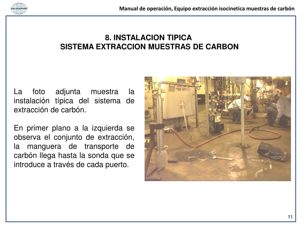 8. INSTALACION TIPICA SISTEMA EXTRACCION MUESTRAS DE CARBON La foto adjunta muestra la instalación típica del sistema de extracción de carbón. En primer plano a la izquierda se observa el conjunto de extracción, la manguera de transporte de carbón llega hasta la sonda que se introduce a través de cada puerto. 11