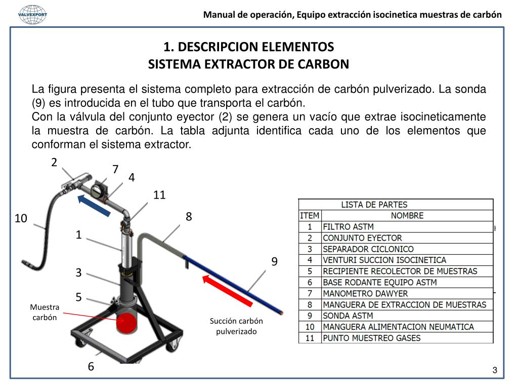 1. DESCRIPCION ELEMENTOS SISTEMA EXTRACTOR DE CARBON La figura presenta el sistema completo para extracción de carbón pulverizado. La sonda (9) es introducida en el tubo que transporta el carbón. Con la válvula del conjunto eyector (2) se genera un vacío que extrae isocineticamente la muestra de carbón. La tabla adjunta identifica cada uno de los elementos que conforman el sistema extractor. Muestra carbón Succión carbón pulverizado 3