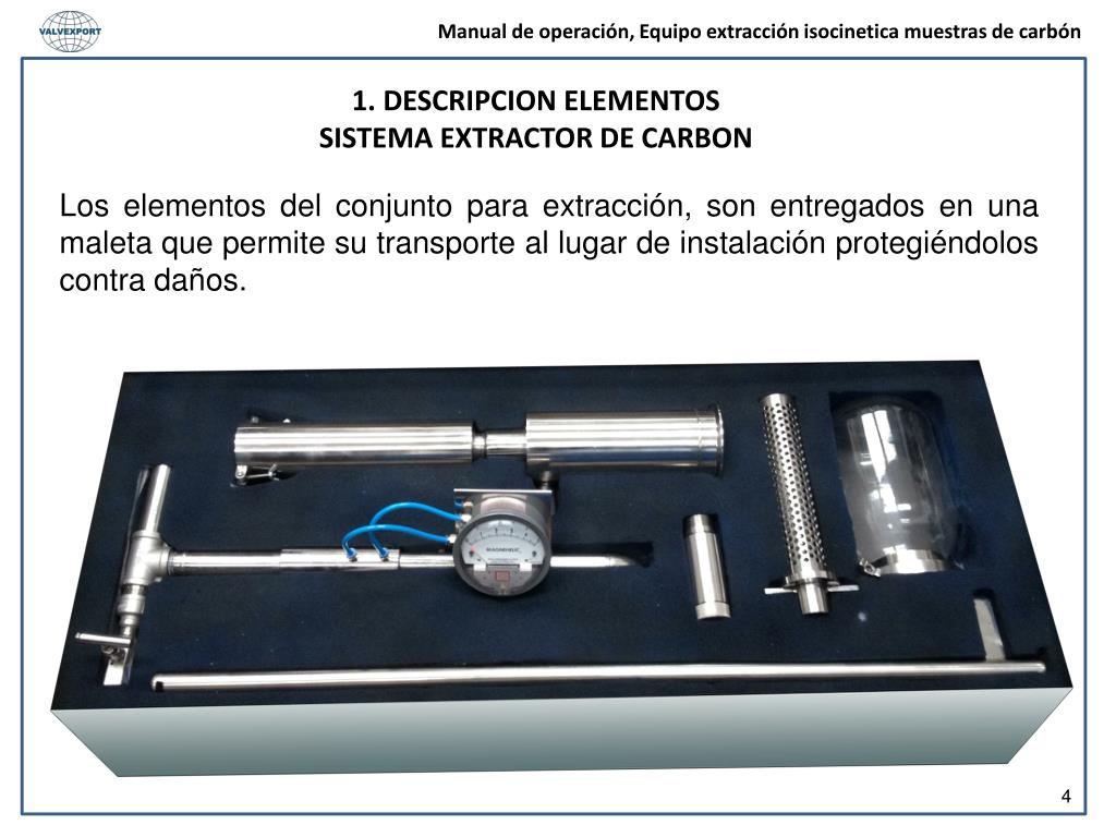 1. DESCRIPCION ELEMENTOS SISTEMA EXTRACTOR DE CARBON Los elementos del conjunto para extracción, son entregados en una maleta que permite su transporte al lugar de instalación protegiéndolos contra daños. 4