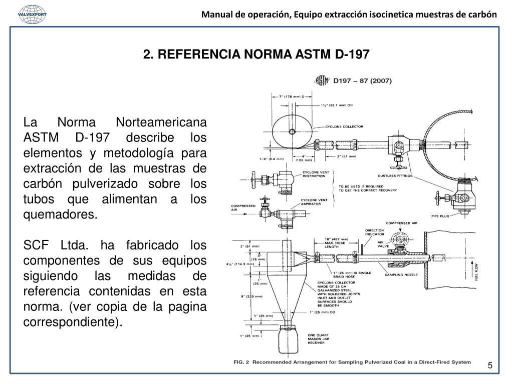 2. REFERENCIA NORMA ASTM D-197 La Norma Norteamericana ASTM D-197 describe los elementos y metodología para extracción de las muestras de carbón pulverizado sobre los tubos que alimentan a los quemadores. SCF Ltda. ha fabricado los componentes de sus equipos siguiendo las medidas de referencia contenidas en esta norma. (ver copia de la pagina correspondiente). 5