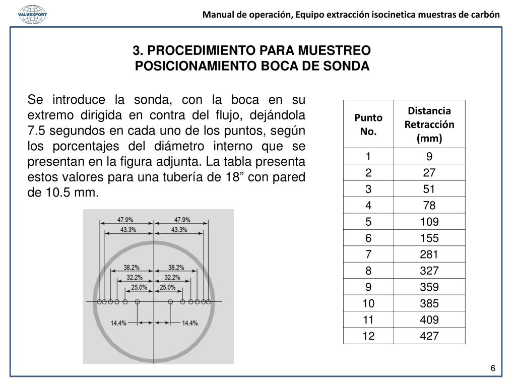 3. PROCEDIMIENTO PARA MUESTREO POSICIONAMIENTO BOCA DE SONDA Se introduce la sonda, con la boca en su extremo dirigida en contra del flujo, dejándola 7.5 segundos en cada uno de los puntos, según los porcentajes del diámetro interno que se presentan en la figura adjunta. La tabla presenta estos valores para una tubería de 18” con pared de 10.5 mm. 6