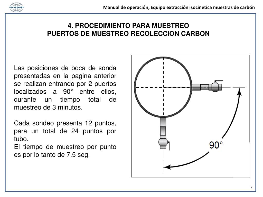 4. PROCEDIMIENTO PARA MUESTREO PUERTOS DE MUESTREO RECOLECCION CARBON Las posiciones de boca de sonda presentadas en la pagina anterior se realizan entrando por 2 puertos localizados a 90° entre ellos, durante un tiempo total de muestreo de 3 minutos. Cada sondeo presenta 12 puntos, para un total de 24 puntos por tubo. El tiempo de muestreo por punto es por lo tanto de 7.5 seg. 7