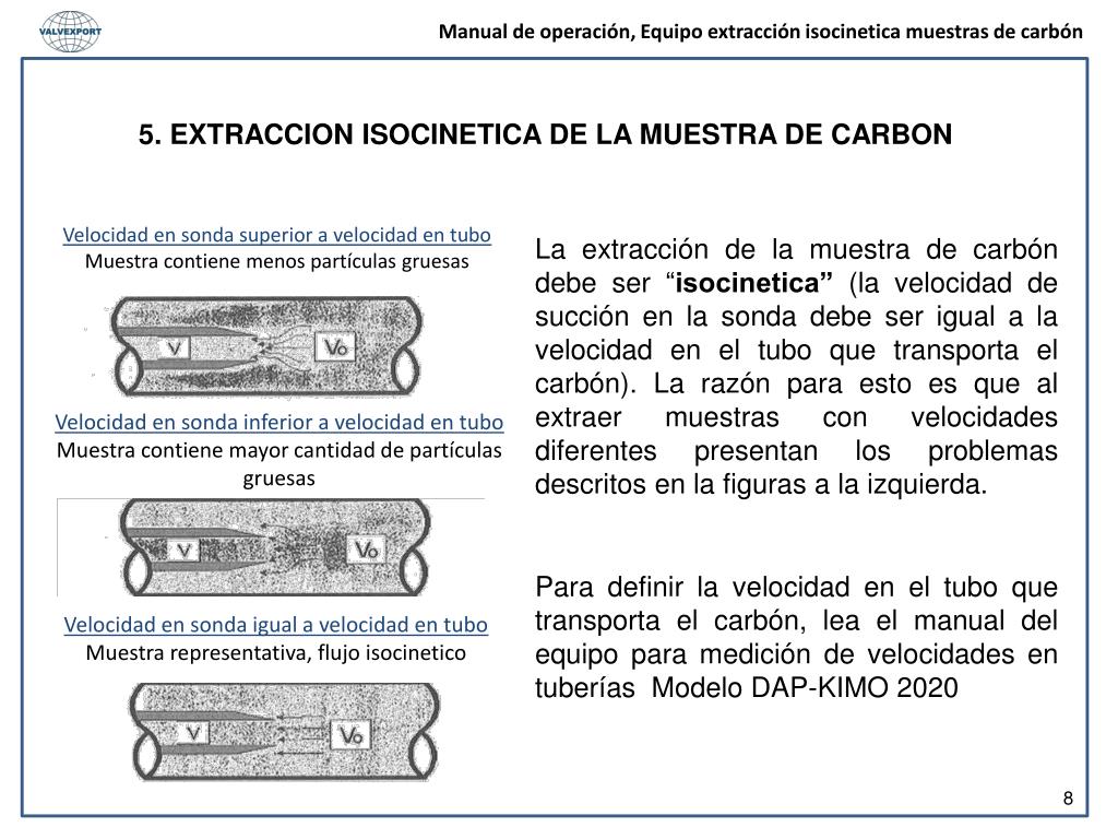 5. EXTRACCION ISOCINETICA DE LA MUESTRA DE CARBON Velocidad en sonda superior a velocidad en tubo Muestra contiene menos partículas gruesas La extracción de la muestra de carbón debe ser “isocinetica” (la velocidad de succión en la sonda debe ser igual a la velocidad en el tubo que transporta el carbón). La razón para esto es que al extraer muestras con velocidades diferentes presentan los problemas descritos en la figuras a la izquierda. Velocidad en sonda inferior a velocidad en tubo Muestra contiene mayor cantidad de partículas gruesas Para definir la velocidad en el tubo que transporta el carbón, lea el manual del equipo para medición de velocidades en tuberías Modelo DAP-KIMO 2020 Velocidad en sonda igual a velocidad en tubo Muestra representativa, flujo isocinetico 8