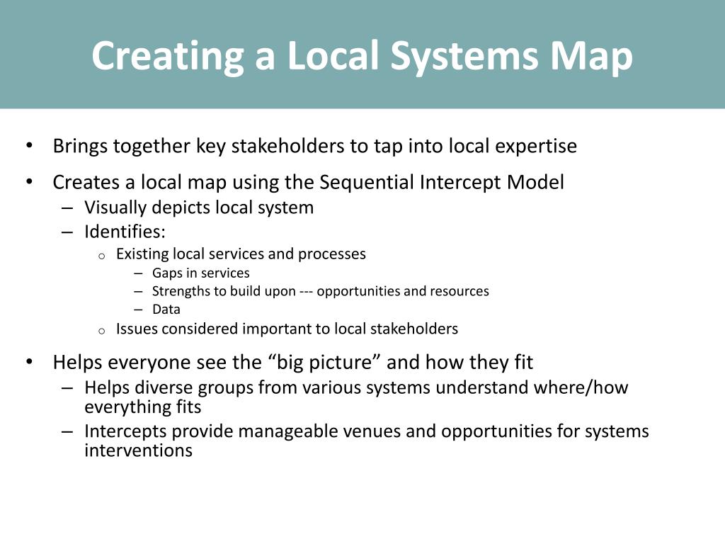 Creating a Local Systems Map • Brings together key stakeholders to tap into local expertise • Creates a local map using the Sequential Intercept Model • Visually depicts local system • Identifies: • Existing local services and processes • Gaps in services • Strengths to build upon --- opportunities and resources • Data • Issues considered important to local stakeholders • Helps everyone see the “big picture” and how they fit • Helps diverse groups from various systems understand where/how everything fits • Intercepts provide manageable venues and opportunities for systems interventions