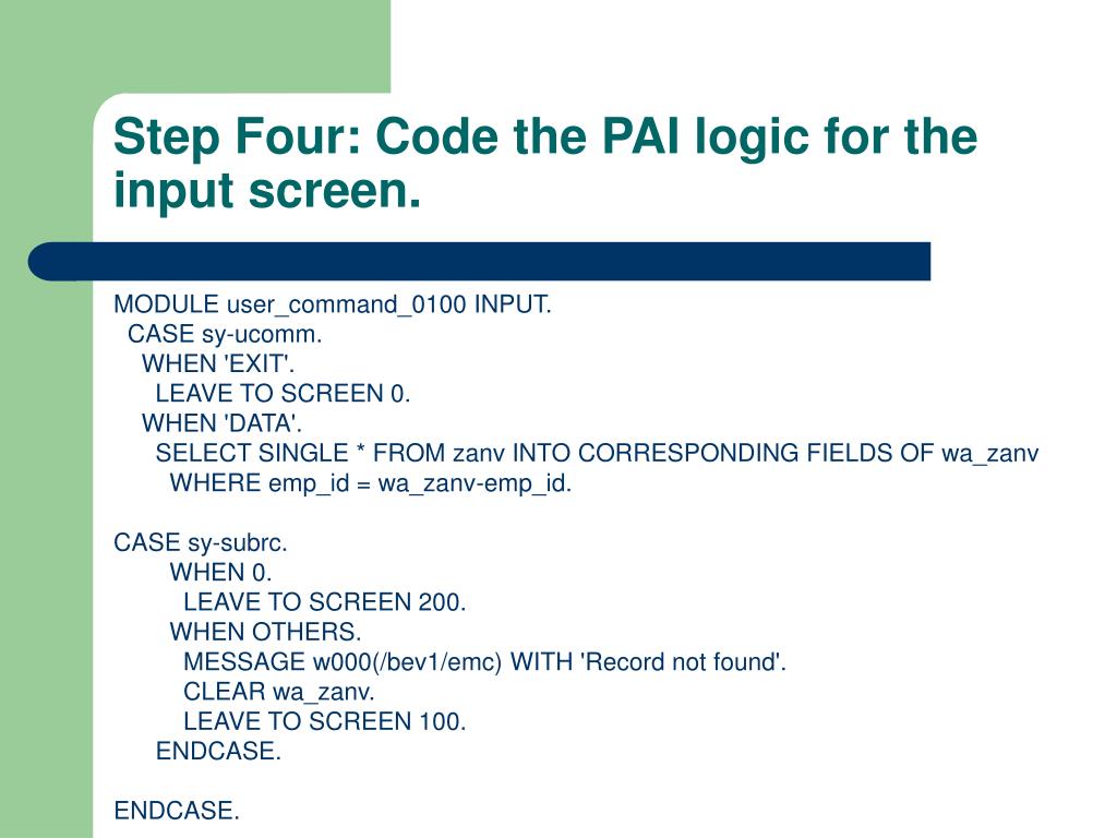 Step Four: Code the PAI logic for the input screen. MODULE user_command_0100 INPUT. CASE sy-ucomm. WHEN 'EXIT'. LEAVE TO SCREEN 0. WHEN 'DATA'. SELECT SINGLE * FROM zanv INTO CORRESPONDING FIELDS OF wa_zanv WHERE emp_id = wa_zanv-emp_id. CASE sy-subrc. WHEN 0. LEAVE TO SCREEN 200. WHEN OTHERS. MESSAGE w000(/bev1/emc) WITH 'Record not found'. CLEAR wa_zanv. LEAVE TO SCREEN 100. ENDCASE. ENDCASE.
