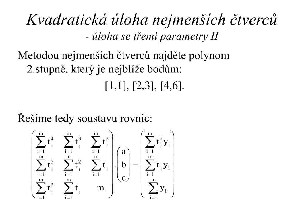 Kvadratická úloha nejmenších čtverců- úloha se třemi parametry Naměřenými body tedy chceme proložit rovnici: y = a.t2 + b.t + c Analogicky jako v lineárním případě lze i v kvadratickém případě tuto speciální úlohu zapsat pomocí soustavy rovnic A.x = b, a to následovně: