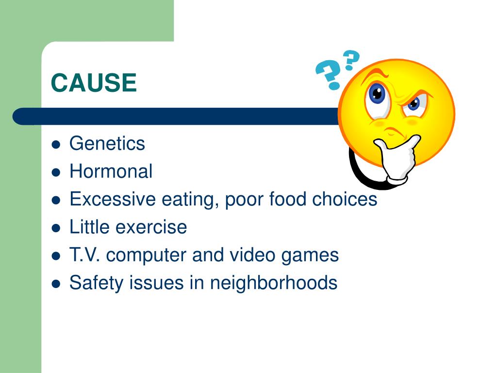 CAUSE • Genetics • Hormonal • Excessive eating, poor food choices • Little exercise • T.V. computer and video games • Safety issues in neighborhoods