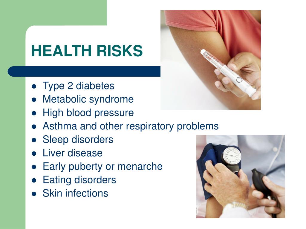 HEALTH RISKS • Type 2 diabetes • Metabolic syndrome • High blood pressure • Asthma and other respiratory problems • Sleep disorders • Liver disease • Early puberty or menarche • Eating disorders • Skin infections