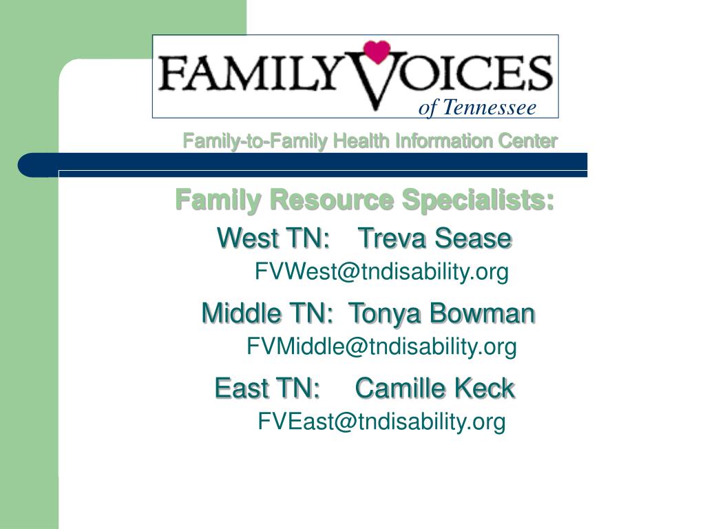 of Tennessee Family-to-Family Health Information Center Family Resource Specialists: West TN: Treva Sease FVWest@tndisability.org Middle TN: Tonya Bowman FVMiddle@tndisability.org East TN: Camille Keck FVEast@tndisability.org