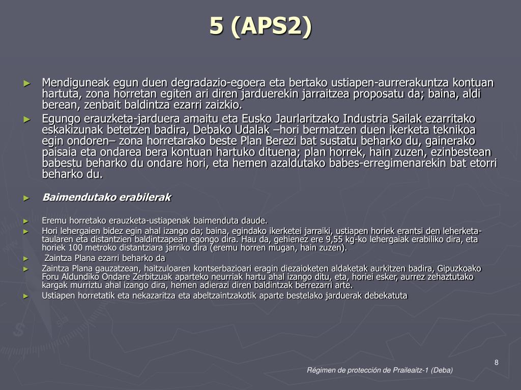 5 (APS2) • Mendiguneak egun duen degradazio-egoera eta bertako ustiapen-aurrerakuntza kontuan hartuta, zona horretan egiten ari diren jarduerekin jarraitzea proposatu da; baina, aldi berean, zenbait baldintza ezarri zaizkio. • Egungo erauzketa-jarduera amaitu eta Eusko Jaurlaritzako Industria Sailak ezarritako eskakizunak betetzen badira, Debako Udalak –hori bermatzen duen ikerketa teknikoa egin ondoren– zona horretarako beste Plan Berezi bat sustatu beharko du, gainerako paisaia eta ondarea bera kontuan hartuko dituena; plan horrek, hain zuzen, ezinbestean babestu beharko du ondare hori, eta hemen azaldutako babes-erregimenarekin bat etorri beharko du. • Baimendutako erabilerak • Eremu horretako erauzketa-ustiapenak baimenduta daude. • Hori lehergaien bidez egin ahal izango da; baina, egindako ikerketei jarraiki, ustiapen horiek erantsi den leherketa-taularen eta distantzien baldintzapean egongo dira. Hau da, gehienez ere 9,55 kg-ko lehergaiak erabiliko dira, eta horiek 100 metroko distantziara jarriko dira (eremu horren mugan, hain zuzen). • Zaintza Plana ezarri beharko da • Zaintza Plana gauzatzean, haitzuloaren kontserbazioari eragin diezaioketen aldaketak aurkitzen badira, Gipuzkoako Foru Aldundiko Ondare Zerbitzuak aparteko neurriak hartu ahal izango ditu, eta, horiei esker, aurrez zehaztutako kargak murriztu ahal izango dira, hemen adierazi diren baldintzak berrezarri arte. • Ustiapen horretatik eta nekazaritza eta abeltzaintzakotik aparte bestelako jarduerak debekatuta Régimen de protección de Praileaitz-1 (Deba)