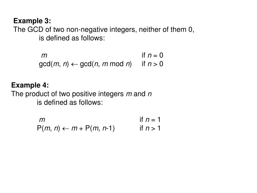 Example 3: The GCD of two non-negative integers, neither of them 0, is defined as follows: m if n = 0 gcd(m, n) gcd(n, m mod n) if n > 0 Example 4: The product of two positive integers m and n is defined as follows: m if n = 1 P(m, n) m + P(m, n-1) if n > 1