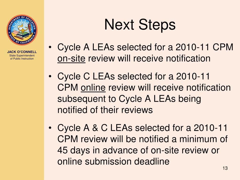 Next Steps • Cycle A LEAs selected for a 2010-11 CPM on-site review will receive notification • Cycle C LEAs selected for a 2010-11 CPM online review will receive notification subsequent to Cycle A LEAs being notified of their reviews • Cycle A & C LEAs selected for a 2010-11 CPM review will be notified a minimum of 45 days in advance of on-site review or online submission deadline