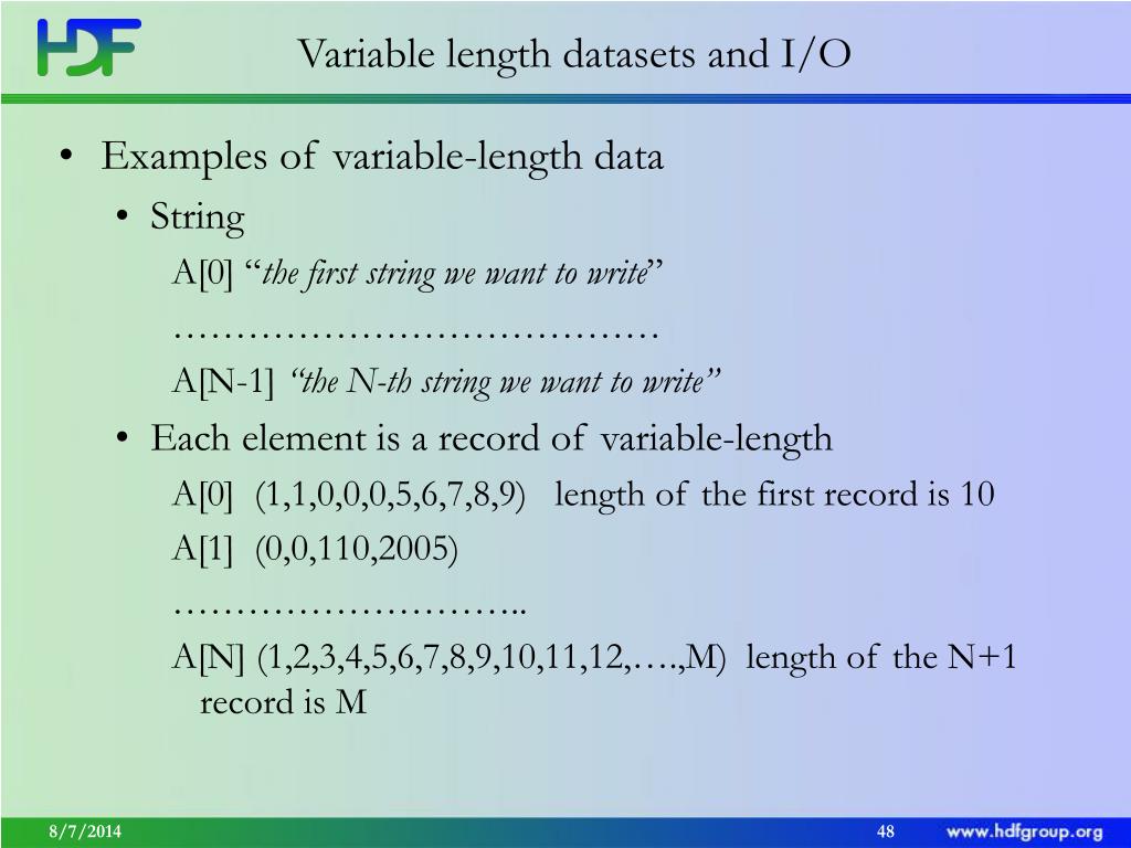 Variable length datasets and I/O • Examples of variable-length data • String A[0] “the first string we want to write” ………………………………… A[N-1] “the N-th string we want to write” • Each element is a record of variable-length A[0] (1,1,0,0,0,5,6,7,8,9) length of the first record is 10 A[1] (0,0,110,2005) ……………………….. A[N] (1,2,3,4,5,6,7,8,9,10,11,12,….,M) length of the N+1 record is M