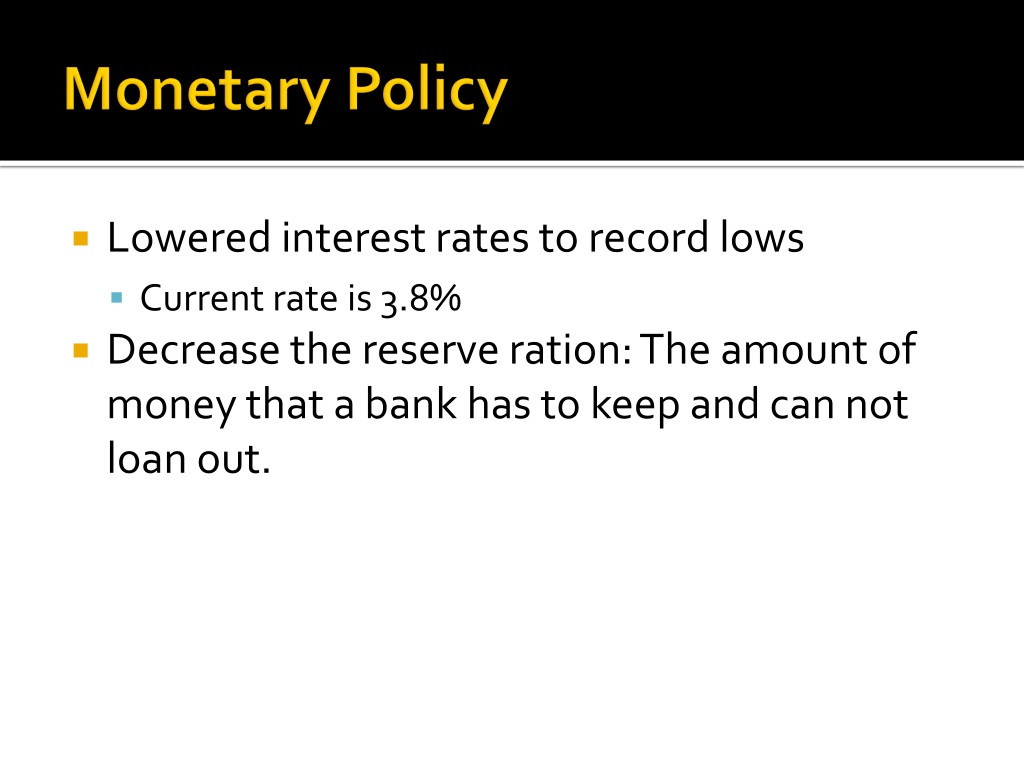 Monetary Policy • Lowered interest rates to record lows • Current rate is 3.8% • Decrease the reserve ration: The amount of money that a bank has to keep and can not loan out.