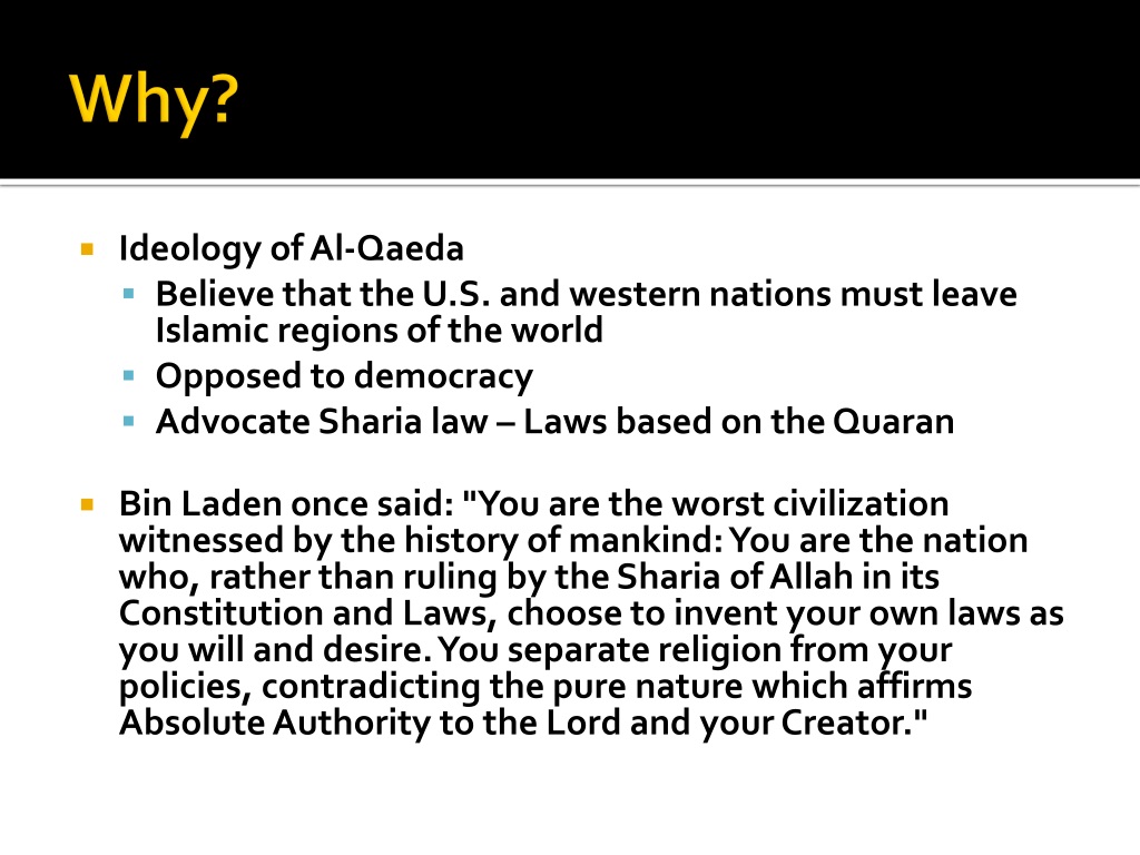 Why? • Ideology of Al-Qaeda • Believe that the U.S. and western nations must leave Islamic regions of the world • Opposed to democracy • Advocate Sharia law – Laws based on the Quaran • Bin Laden once said: "You are the worst civilization witnessed by the history of mankind: You are the nation who, rather than ruling by the Sharia of Allah in its Constitution and Laws, choose to invent your own laws as you will and desire. You separate religion from your policies, contradicting the pure nature which affirms Absolute Authority to the Lord and your Creator."