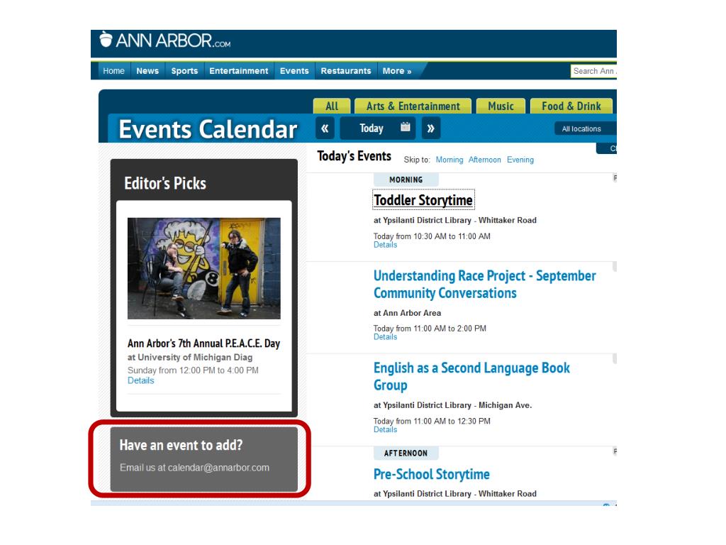 And maybe here? http://annarborchronicle.com/events-listing/ And potentially A2Chron