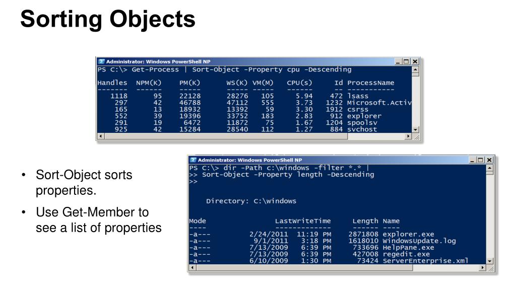 Module Overview • Object across the pipeline • Getting the information you need • Sorting Objects • Selecting Objects • Custom Properties • Filtering data • Methods – When no cmdlet exists