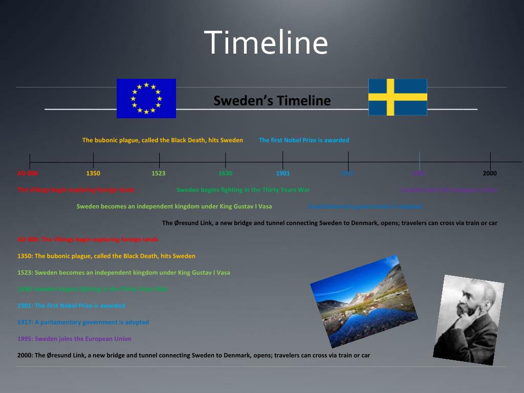 Country info(Pictures, people or text who represent the country) • The monarch of Sweden is : King Carl XVI Gustaf • The prime minister is Prime minister: Fredrik Reinfeldt • Sweden is part of the European Union. The Swedish flag has a blue background The Swedish flower and a yellow cross over it. King Carl XVI Gustaf