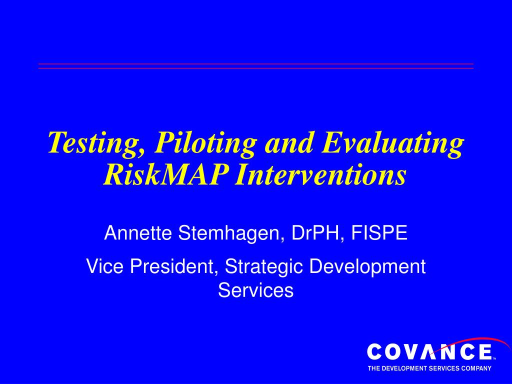 Testing, Piloting and Evaluating RiskMAP Interventions Annette Stemhagen, DrPH, FISPE Vice President, Strategic Development Services