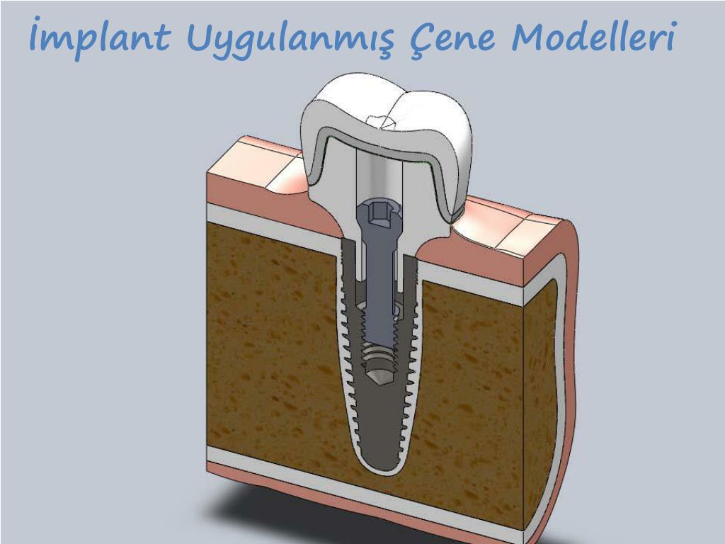 İmplant Yük Analizi Üç boyutlu modellemesi yapılan protezin takılacağı bir erkeğin yemek yerken ısırma ve çiğneme kuvvetleri 222N ve 522N arasındadır. 2mm2lik dairesel yüzeye 90°, 60°, 30° açılarla titanyum ve zirkonyum malzemeden yapılan dayanaklara,uygulanarak tüm senaryolar denenmeye çalışılır. İmplant sistemi üzerindeki gerilmelerin araştırılma sebebi, yapılacak protezin dayanıklılığını ölçmektedir. Aynı zamanda implant ile kemik arasında ki gerilmelerin analizinin yapılmasının sebebi ise implantın ısırma kuvvetinin uygulandığı esnada kemiğin ne kadar zorlandığının saptanmasıdır. İmplant kemiği zorladığında, kemik üzerinde deformasyon yaratırsa protez başarısız olur.