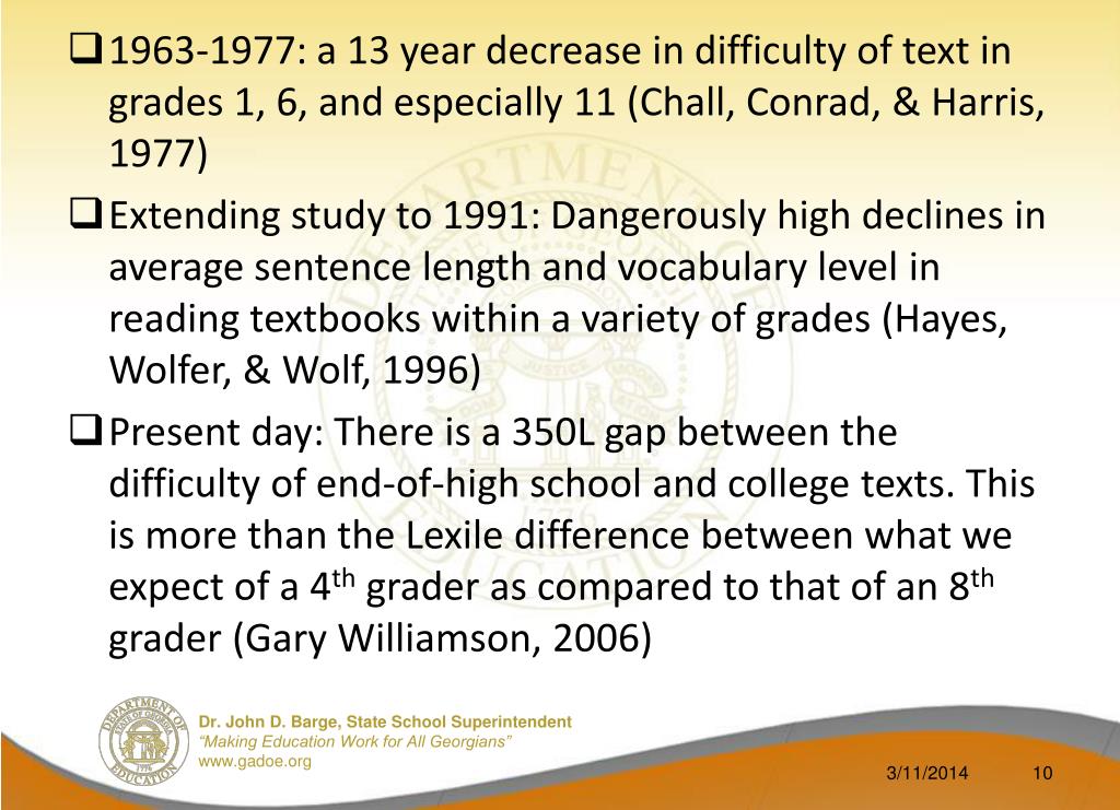 1963-1977: a 13 year decrease in difficulty of text in grades 1, 6, and especially 11 (Chall, Conrad, & Harris, 1977) • Extending study to 1991: Dangerously high declines in average sentence length and vocabulary level in reading textbooks within a variety of grades (Hayes, Wolfer, & Wolf, 1996) • Present day: There is a 350L gap between the difficulty of end-of-high school and college texts. This is more than the Lexile difference between what we expect of a 4th grader as compared to that of an 8th grader (Gary Williamson, 2006)