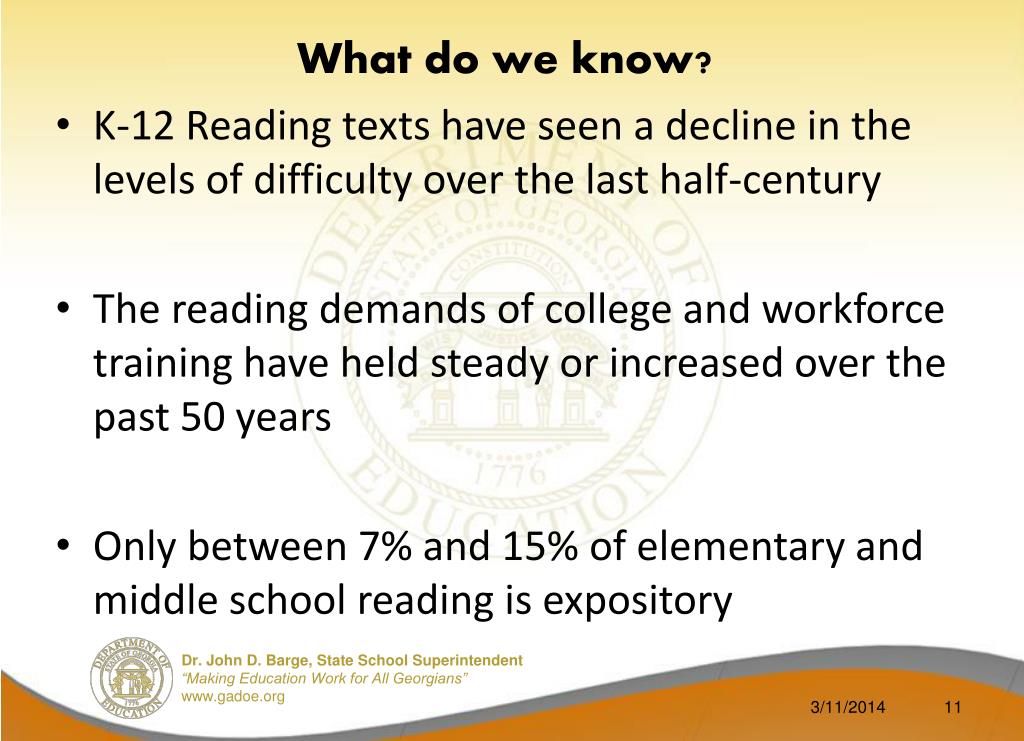 What do we know? • K-12 Reading texts have seen a decline in the levels of difficulty over the last half-century • The reading demands of college and workforce training have held steady or increased over the past 50 years • Only between 7% and 15% of elementary and middle school reading is expository