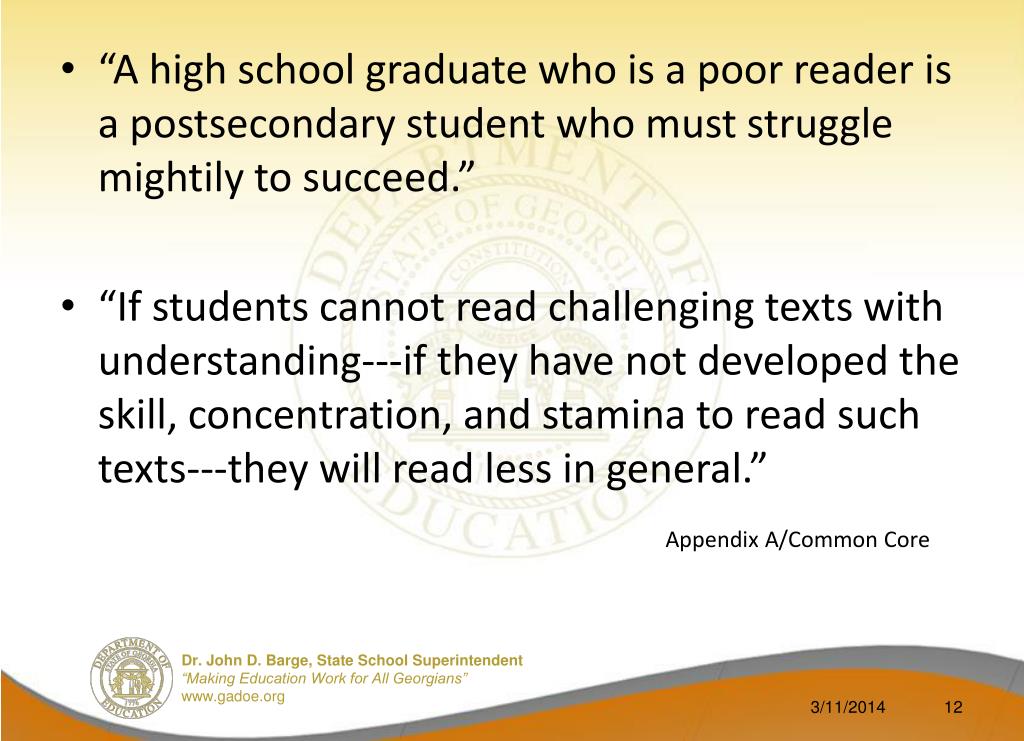 “A high school graduate who is a poor reader is a postsecondary student who must struggle mightily to succeed.” • “If students cannot read challenging texts with understanding---if they have not developed the skill, concentration, and stamina to read such texts---they will read less in general.” Appendix A/Common Core