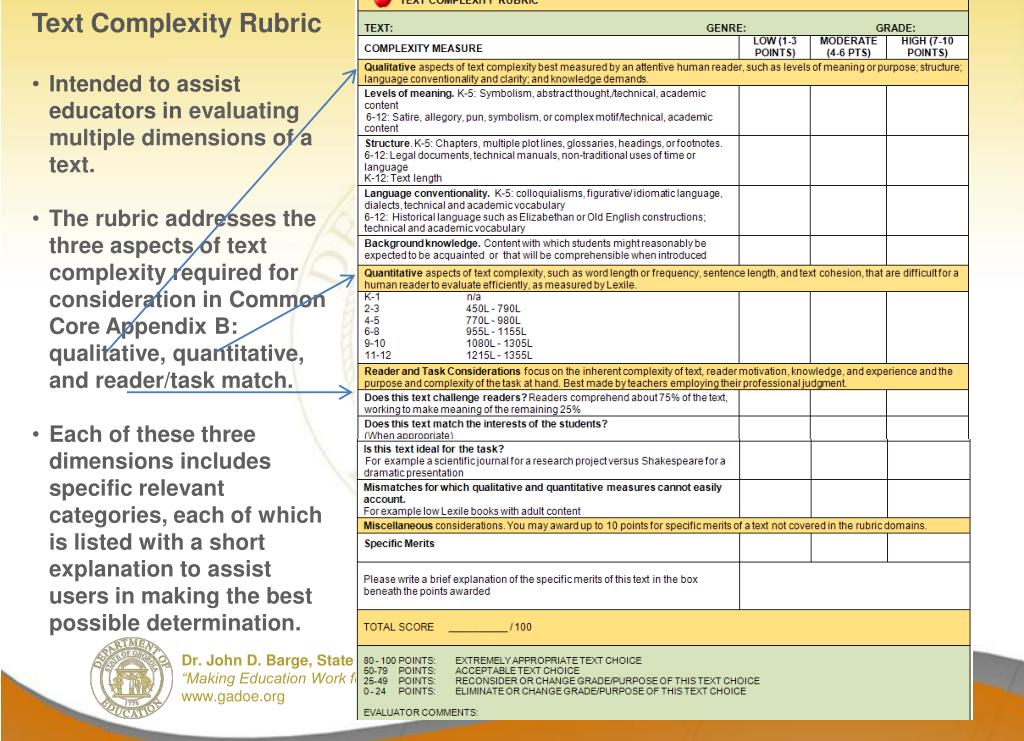 Reader and Task Does this text challenge readers? Aim for 75% comprehension rate. 10 = challenges students within that target range. Does this text match the interests of the students? Cannot always be the primary indicator, but even technical texts can be chosen to provide connection with students. 10 = best choice for the target age and demographic. Is this text ideal for the task? A scientific journal will be a better match for a research project than for a skit depicting the content. 10 = best possible match for the task. Mismatches for which qualitative and quantitative measures cannot easily account. Provides evaluators with a category to bestow or withhold points based on disconnect that may not be addressed in other rubric dimensions. 10 = no mismatch and would be entirely appropriate for the target audience and purpose.
