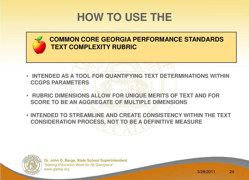 HOW TO USE THE • INTENDED AS A TOOL FOR QUANTIFYING TEXT DETERMINATIONS WITHIN CCGPS PARAMETERS • RUBRIC DIMENSIONS ALLOW FOR UNIQUE MERITS OF TEXT AND FOR SCORE TO BE AN AGGREGATE OF MULTIPLE DIMENSIONS • INTENDED TO STREAMLINE AND CREATE CONSISTENCY WITHIN THE TEXT CONSIDERATION PROCESS, NOT TO BE A DEFINITIVE MEASURE