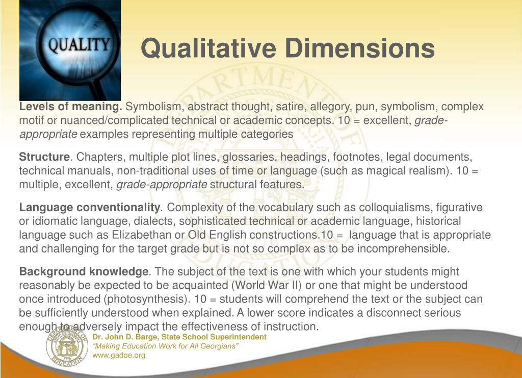 Qualitative Dimensions Levels of meaning. Symbolism, abstract thought, satire, allegory, pun, symbolism, complex motif or nuanced/complicated technical or academic concepts. 10 = excellent, grade-appropriate examples representing multiple categories Structure. Chapters, multiple plot lines, glossaries, headings, footnotes, legal documents, technical manuals, non-traditional uses of time or language (such as magical realism). 10 = multiple, excellent, grade-appropriate structural features. Language conventionality. Complexity of the vocabulary such as colloquialisms, figurative or idiomatic language, dialects, sophisticated technical or academic language, historical language such as Elizabethan or Old English constructions.10 = language that is appropriate and challenging for the target grade but is not so complex as to be incomprehensible. Background knowledge. The subject of the text is one with which your students might reasonably be expected to be acquainted (World War II) or one that might be understood once introduced (photosynthesis). 10 = students will comprehend the text or the subject can be sufficiently understood when explained. A lower score indicates a disconnect serious enough to adversely impact the effectiveness of instruction.