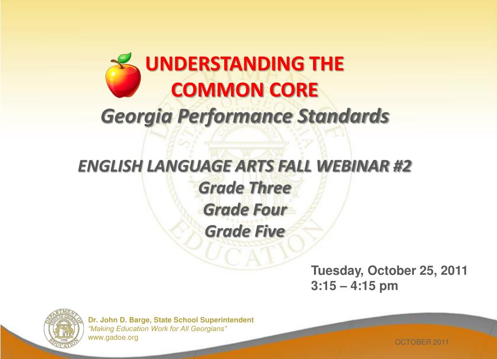 UNDERSTANDING THECOMMON CORE Georgia Performance StandardsENGLISH LANGUAGE ARTS FALL WEBINAR #2Grade ThreeGrade FourGrade Five Tuesday, October 25, 20113:15 – 4:15 pm OCTOBER 2011