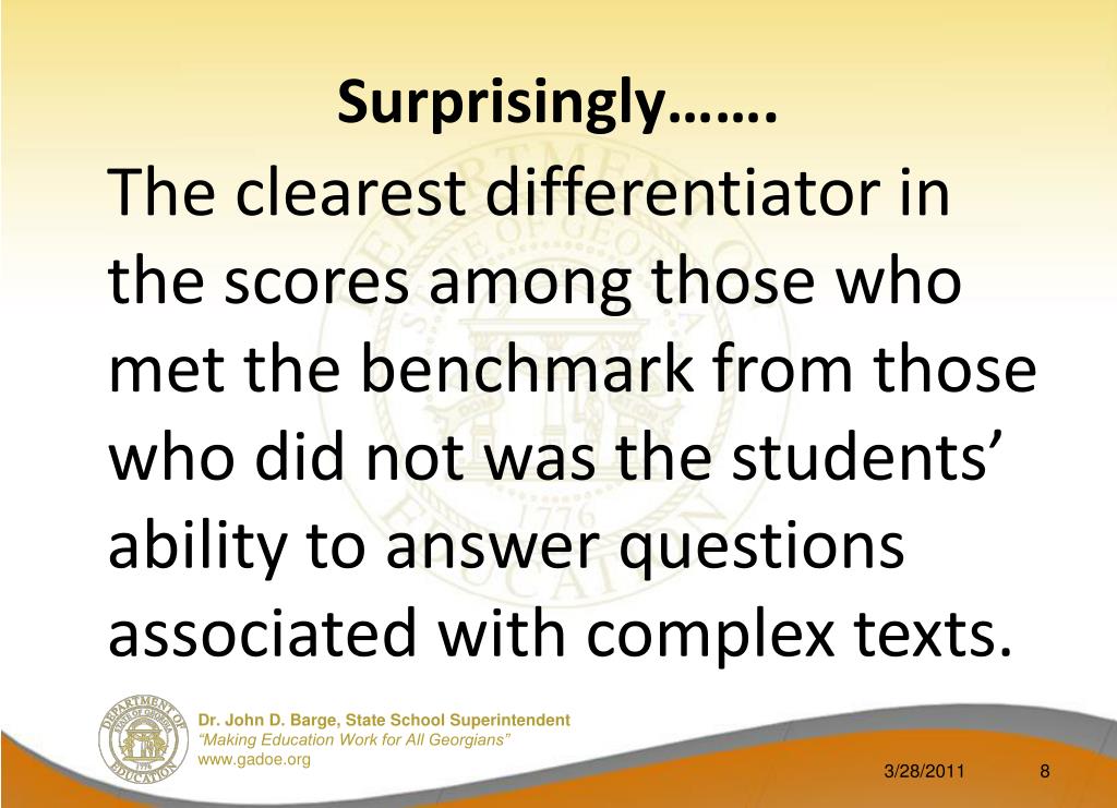 Surprisingly……. The clearest differentiator in the scores among those who met the benchmark from those who did not was the students’ ability to answer questions associated with complex texts.