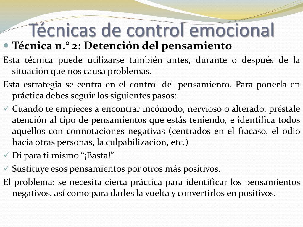 Técnicas de control emocional • Técnica n.° 2: Detención del pensamiento Esta técnica puede utilizarse también antes, durante o después de la situación que nos causa problemas. Esta estrategia se centra en el control del pensamiento. Para ponerla en práctica debes seguir los siguientes pasos: • Cuando te empieces a encontrar incómodo, nervioso o alterado, préstale atención al tipo de pensamientos que estás teniendo, e identifica todos aquellos con connotaciones negativas (centrados en el fracaso, el odio hacia otras personas, la culpabilización, etc.) • Di para ti mismo “¡Basta!” • Sustituye esos pensamientos por otros más positivos. El problema: se necesita cierta práctica para identificar los pensamientos negativos, así como para darles la vuelta y convertirlos en positivos.