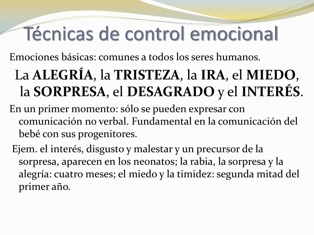 Técnicas de control emocional Emociones básicas: comunes a todos los seres humanos. La ALEGRÍA, la TRISTEZA, la IRA, el MIEDO, la SORPRESA, el DESAGRADO y el INTERÉS. En un primer momento: sólo se pueden expresar con comunicación no verbal. Fundamental en la comunicación del bebé con sus progenitores. Ejem. el interés, disgusto y malestar y un precursor de la sorpresa, aparecen en los neonatos; la rabia, la sorpresa y la alegría: cuatro meses; el miedo y la timidez: segunda mitad del primer año.