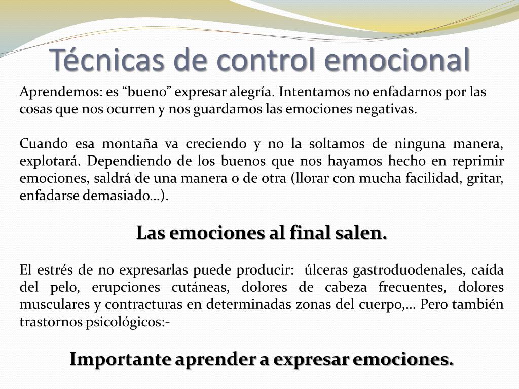 Técnicas de control emocional Aprendemos: es “bueno” expresar alegría. Intentamos no enfadarnos por las cosas que nos ocurren y nos guardamos las emociones negativas. Cuando esa montaña va creciendo y no la soltamos de ninguna manera, explotará. Dependiendo de los buenos que nos hayamos hecho en reprimir emociones, saldrá de una manera o de otra (llorar con mucha facilidad, gritar, enfadarse demasiado…). Las emociones al final salen. El estrés de no expresarlas puede producir: úlceras gastroduodenales, caída del pelo, erupciones cutáneas, dolores de cabeza frecuentes, dolores musculares y contracturas en determinadas zonas del cuerpo,… Pero también trastornos psicológicos:- Importante aprender a expresar emociones.
