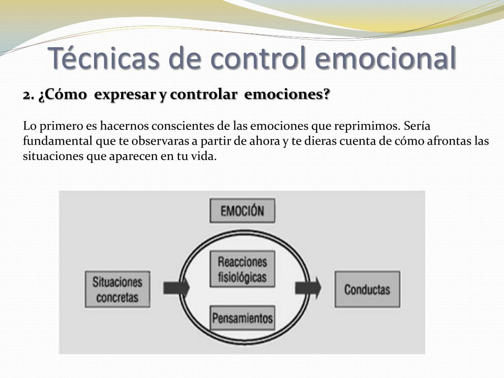 Técnicas de control emocional 2. ¿Cómo expresar y controlar emociones? Lo primero es hacernos conscientes de las emociones que reprimimos. Sería fundamental que te observaras a partir de ahora y te dieras cuenta de cómo afrontas las situaciones que aparecen en tu vida.