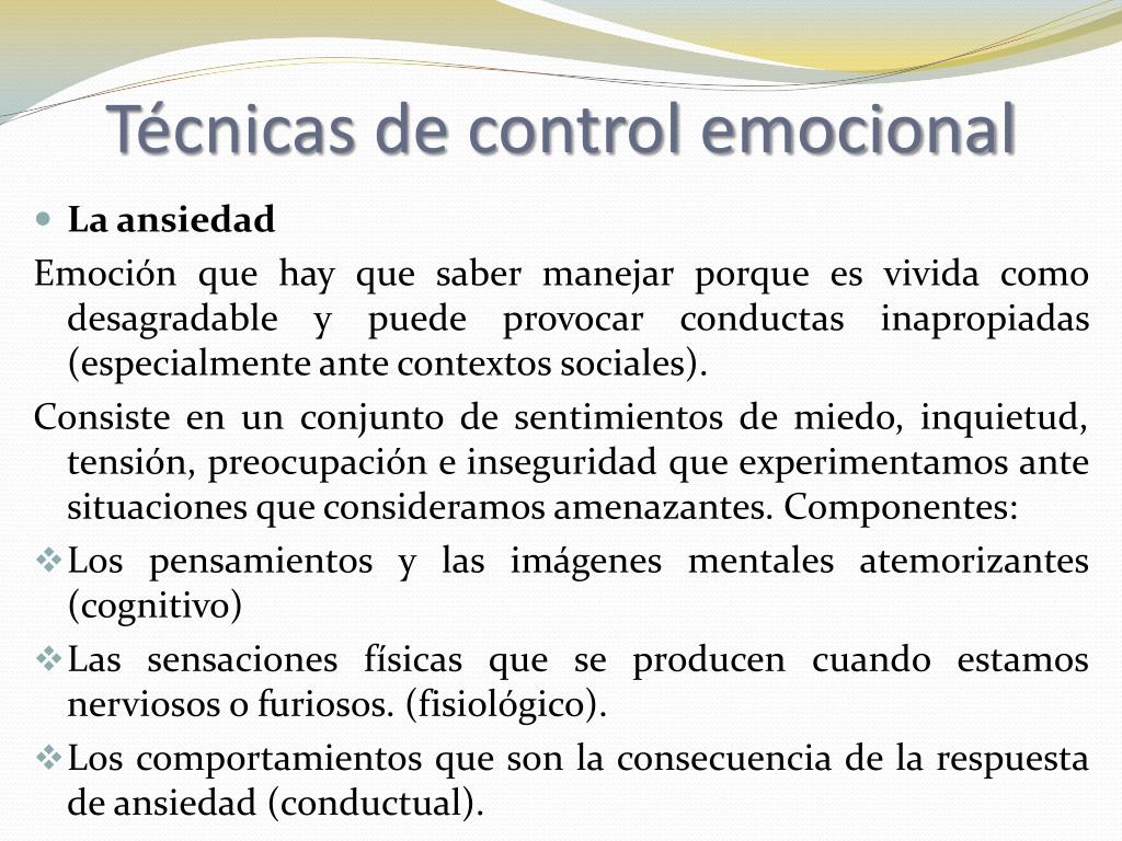 Técnicas de control emocional • La ansiedad Emoción que hay que saber manejar porque es vivida como desagradable y puede provocar conductas inapropiadas (especialmente ante contextos sociales). Consiste en un conjunto de sentimientos de miedo, inquietud, tensión, preocupación e inseguridad que experimentamos ante situaciones que consideramos amenazantes. Componentes: • Los pensamientos y las imágenes mentales atemorizantes (cognitivo) • Las sensaciones físicas que se producen cuando estamos nerviosos o furiosos. (fisiológico). • Los comportamientos que son la consecuencia de la respuesta de ansiedad (conductual).