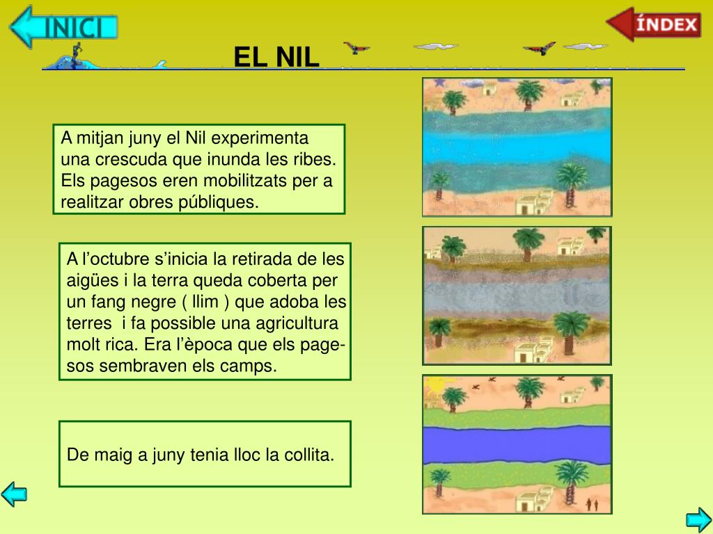 EL NIL A mitjan juny el Nil experimenta una crescuda que inunda les ribes. Els pagesos eren mobilitzats per a realitzar obres públiques. A l’octubre s’inicia la retirada de les aigües i la terra queda coberta per un fang negre ( llim ) que adoba les terres i fa possible una agricultura molt rica. Era l’època que els page- sos sembraven els camps. De maig a juny tenia lloc la collita.