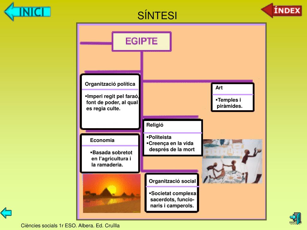 SÍNTESI • Organització política • Imperi regit pel faraó, font de poder, al qual es regia culte. • Art • Temples i • piràmides. • Religió • Politeista • Creença en la vida després de la mort • Economia • Basada sobretot en l’agricultura i la ramaderia. • Organització social • Societat complexa: sacerdots, funcio- naris i camperols. Ciències socials 1r ESO. Albera. Ed. Cruïlla