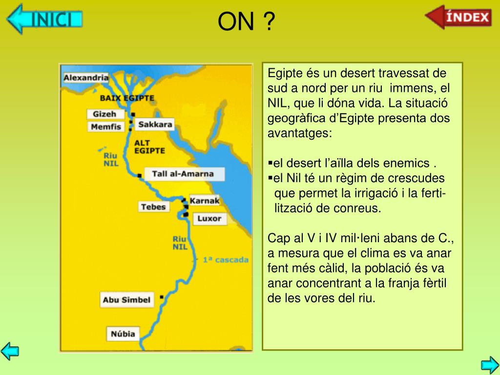 ON ? • Egipte és un desert travessat de • sud a nord per un riu immens, el • NIL, que li dóna vida. La situació • geogràfica d’Egipte presenta dos • avantatges: • el desert l’aïlla dels enemics . • el Nil té un règim de crescudes que permet la irrigació i la ferti- lització de conreus. Cap al V i IV mil·leni abans de C., a mesura que el clima es va anar fent més càlid, la població és va anar concentrant a la franja fèrtil de les vores del riu.
