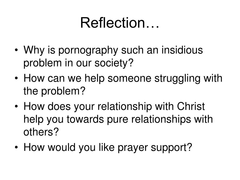 Reflection… • Why is pornography such an insidious problem in our society? • How can we help someone struggling with the problem? • How does your relationship with Christ help you towards pure relationships with others? • How would you like prayer support?