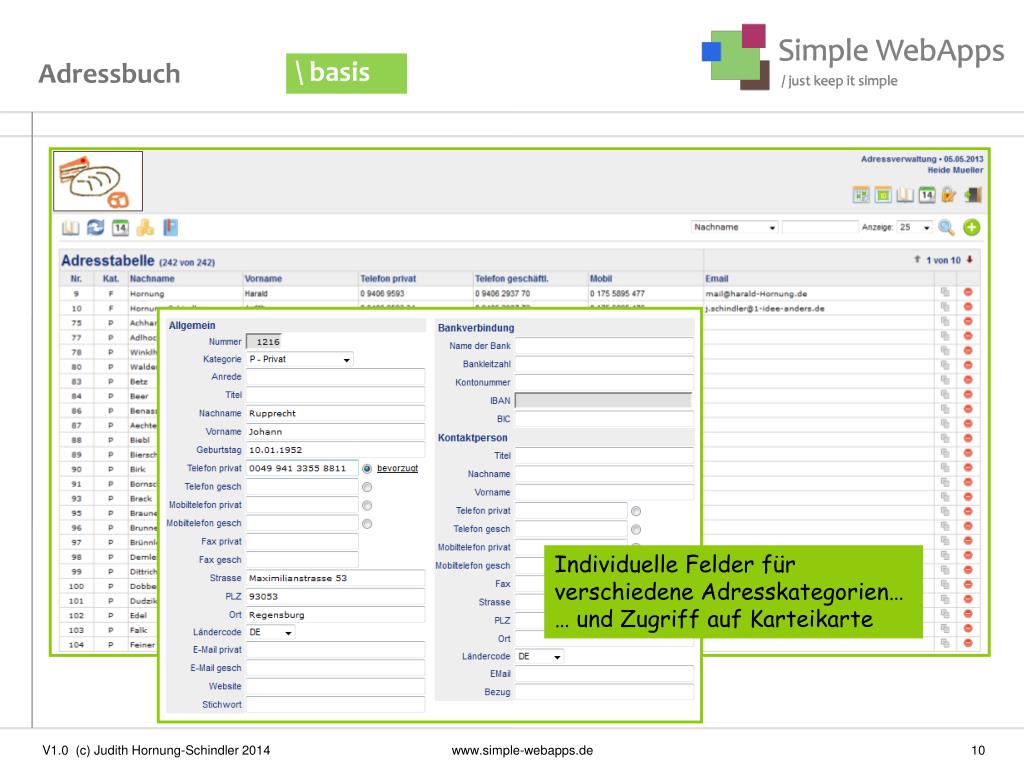 Adressbuch \ basis Individuelle Felder für verschiedene Adresskategorien… … und Zugriff auf Karteikarte