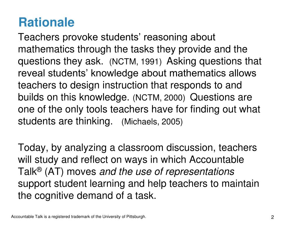 Rationale Teachers provoke students’ reasoning about mathematics through the tasks they provide and the questions they ask. (NCTM, 1991) Asking questions that reveal students’ knowledge about mathematics allows teachers to design instruction that responds to and builds on this knowledge. (NCTM, 2000) Questions are one of the only tools teachers have for finding out what students are thinking. (Michaels, 2005) Today, by analyzing a classroom discussion, teachers will study and reflect on ways in which Accountable Talk®(AT) moves and the use of representations support student learning and help teachers to maintain the cognitive demand of a task. Accountable Talk is a registered trademark of the University of Pittsburgh.