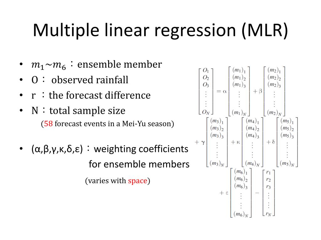 Multiple linear regression (MLR) • O: observed rainfall • r :the forecast difference • N:total sample size (58 forecast events in a Mei-Yu season) • (α,β,γ,κ,δ,ε):weighting coefficients for ensemble members (varies with space)