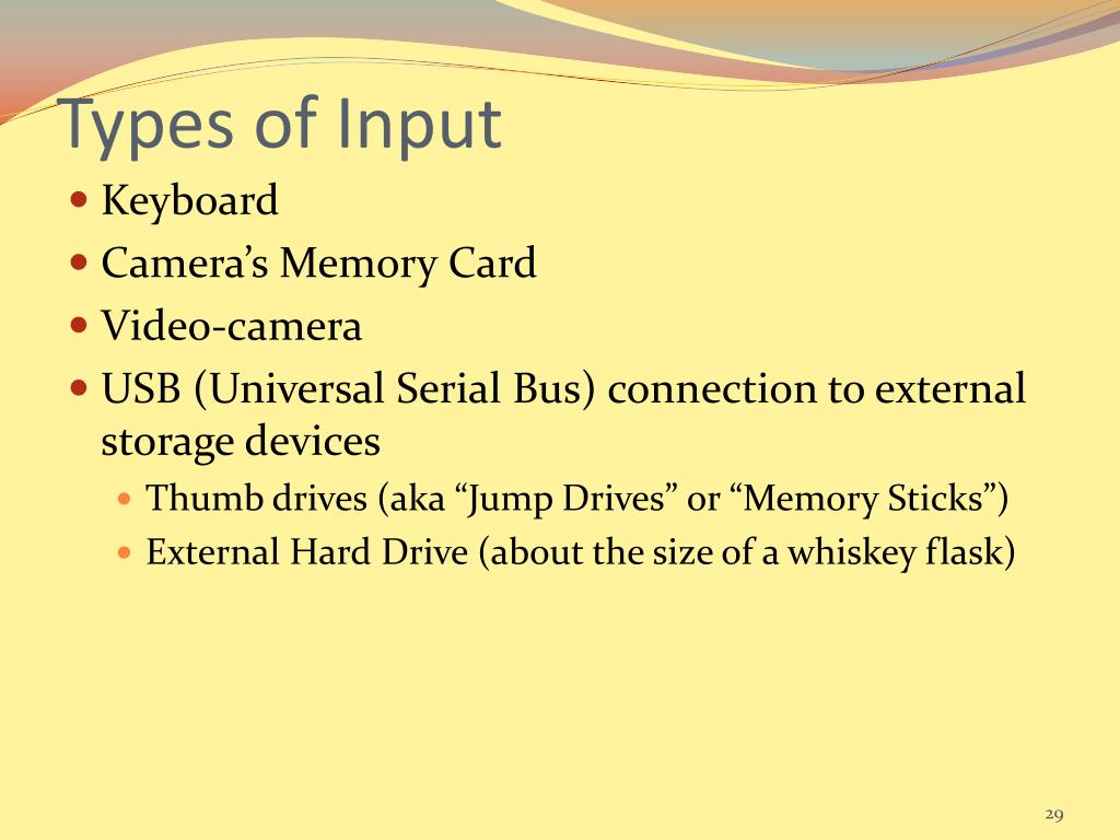 Types of Input • Keyboard • Camera’s Memory Card • Video-camera • USB (Universal Serial Bus) connection to external storage devices • Thumb drives (aka “Jump Drives” or “Memory Sticks”) • External Hard Drive (about the size of a whiskey flask)