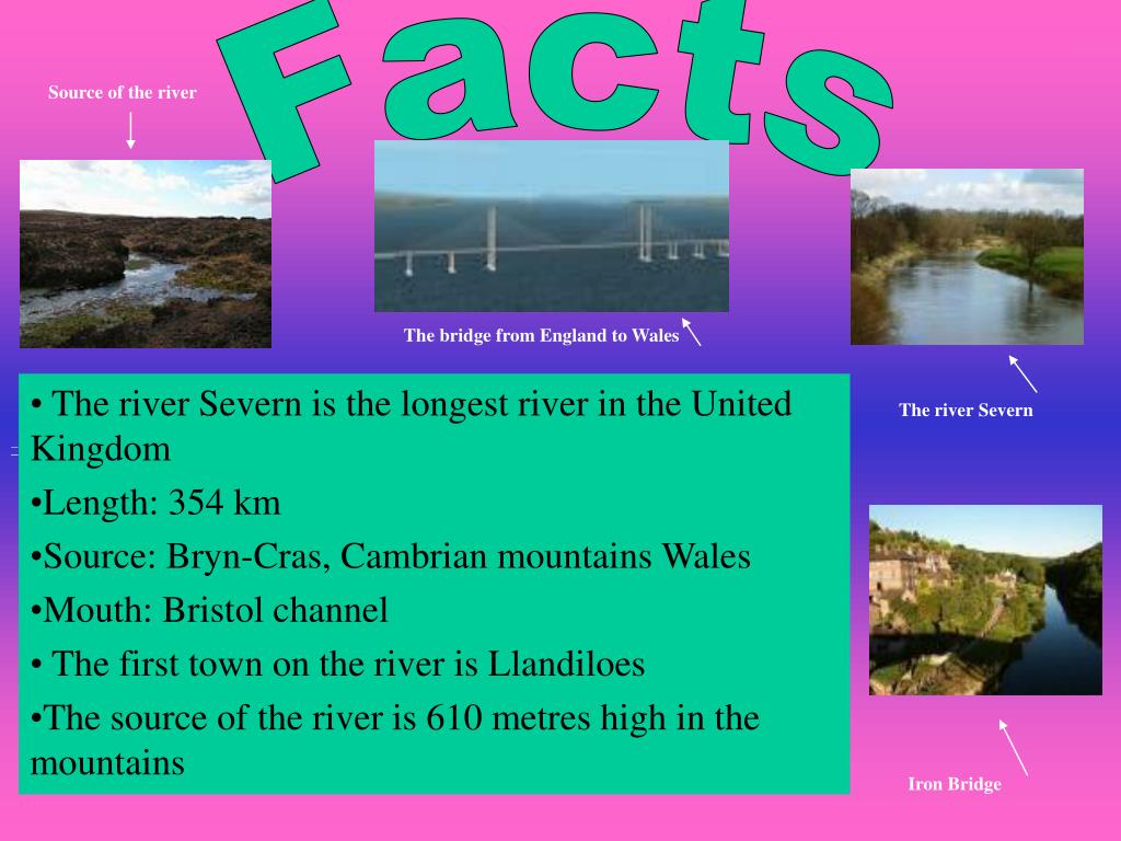 Source of the river Facts The bridge from England to Wales The river Severn The river Severn is the longest river in the United Kingdom Length: 354 km Source: Bryn-Cras, Cambrian mountains Wales Mouth: Bristol channel The first town on the river is Llandiloes The source of the river is 610 metres high in the mountains Iron Bridge