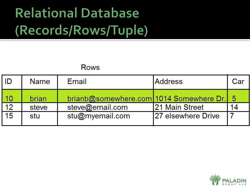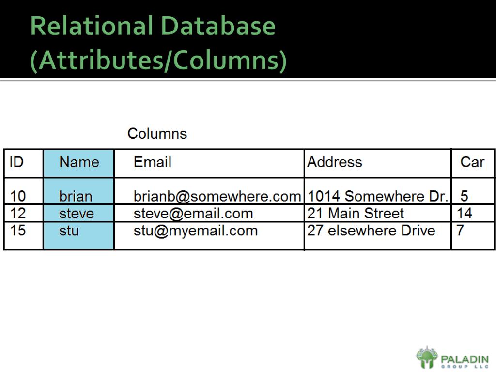 Databases Relational The traditional database model. Uses attributes (columns) and tuples (rows) to store and organize data. These tuples create tables (next slide) Most commonly used type of database (more)