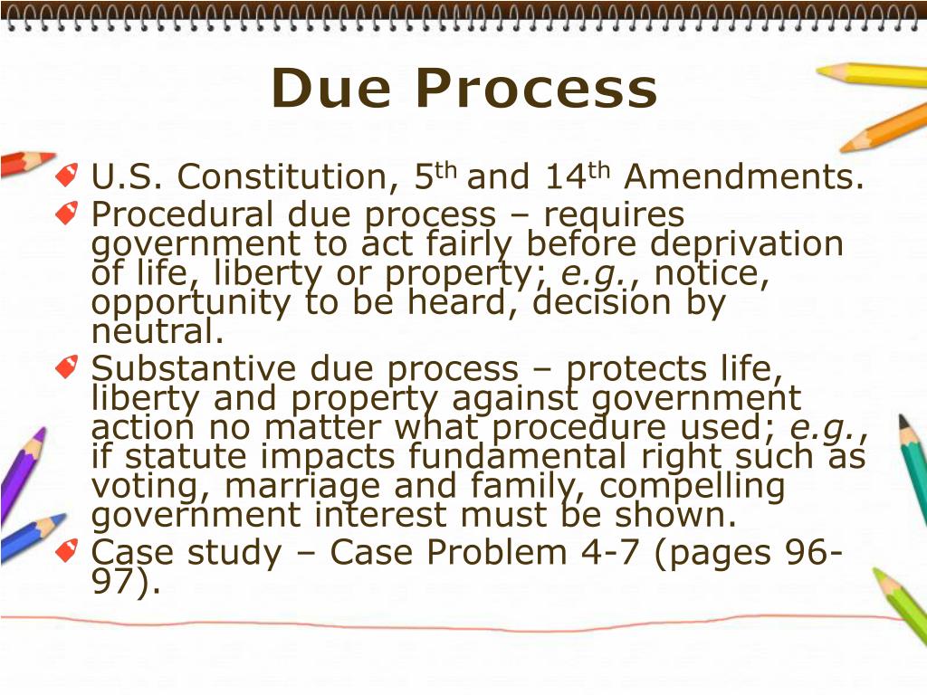 Due Process • U.S. Constitution, 5th and 14th Amendments. • Procedural due process – requires government to act fairly before deprivation of life, liberty or property; e.g., notice, opportunity to be heard, decision by neutral. • Substantive due process – protects life, liberty and property against government action no matter what procedure used; e.g., if statute impacts fundamental right such as voting, marriage and family, compelling government interest must be shown. • Case study – Case Problem 4-7 (pages 96-97).